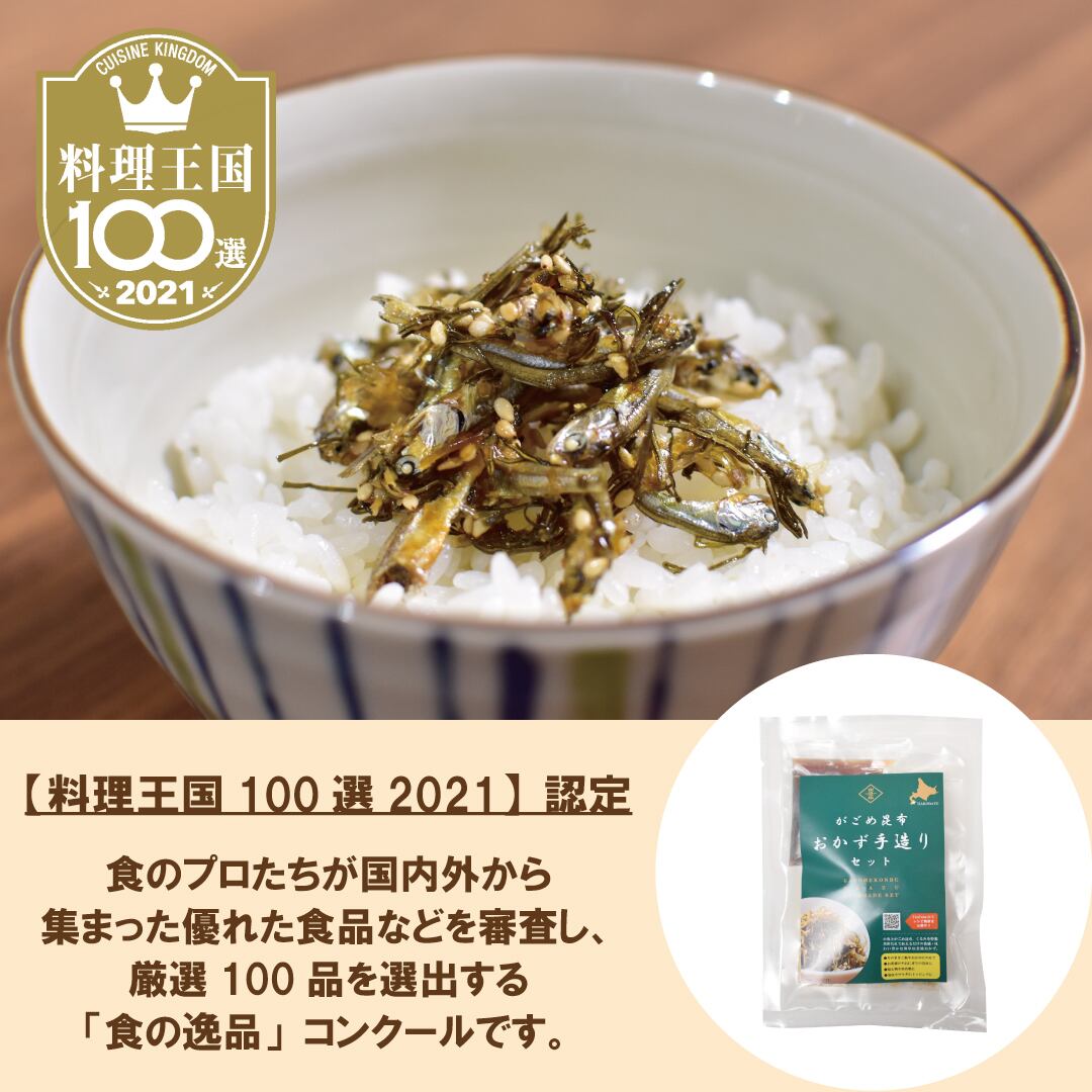 函館産昆布と小魚、標津産の鮭節だしがベストマッチ。添付の特製黒酢たれと水(30cc)を和えるだけで佃煮風の味わいに。クルミやごまのプチプチとした食感がクセになる、味わい豊かなご飯のお供です。
