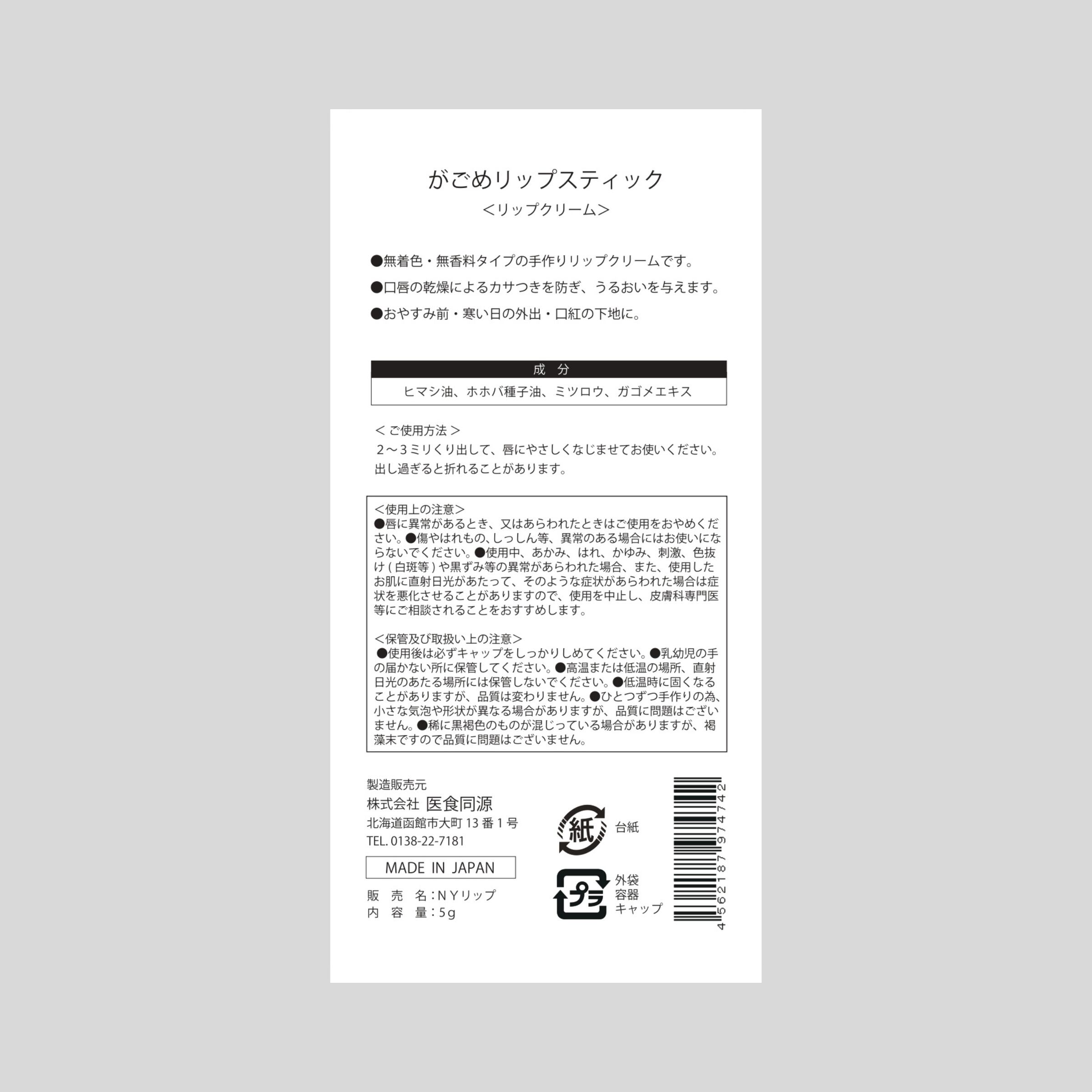 【成分】ヒマシ油、ホホバ油、ミツロウ、ガゴメエキス